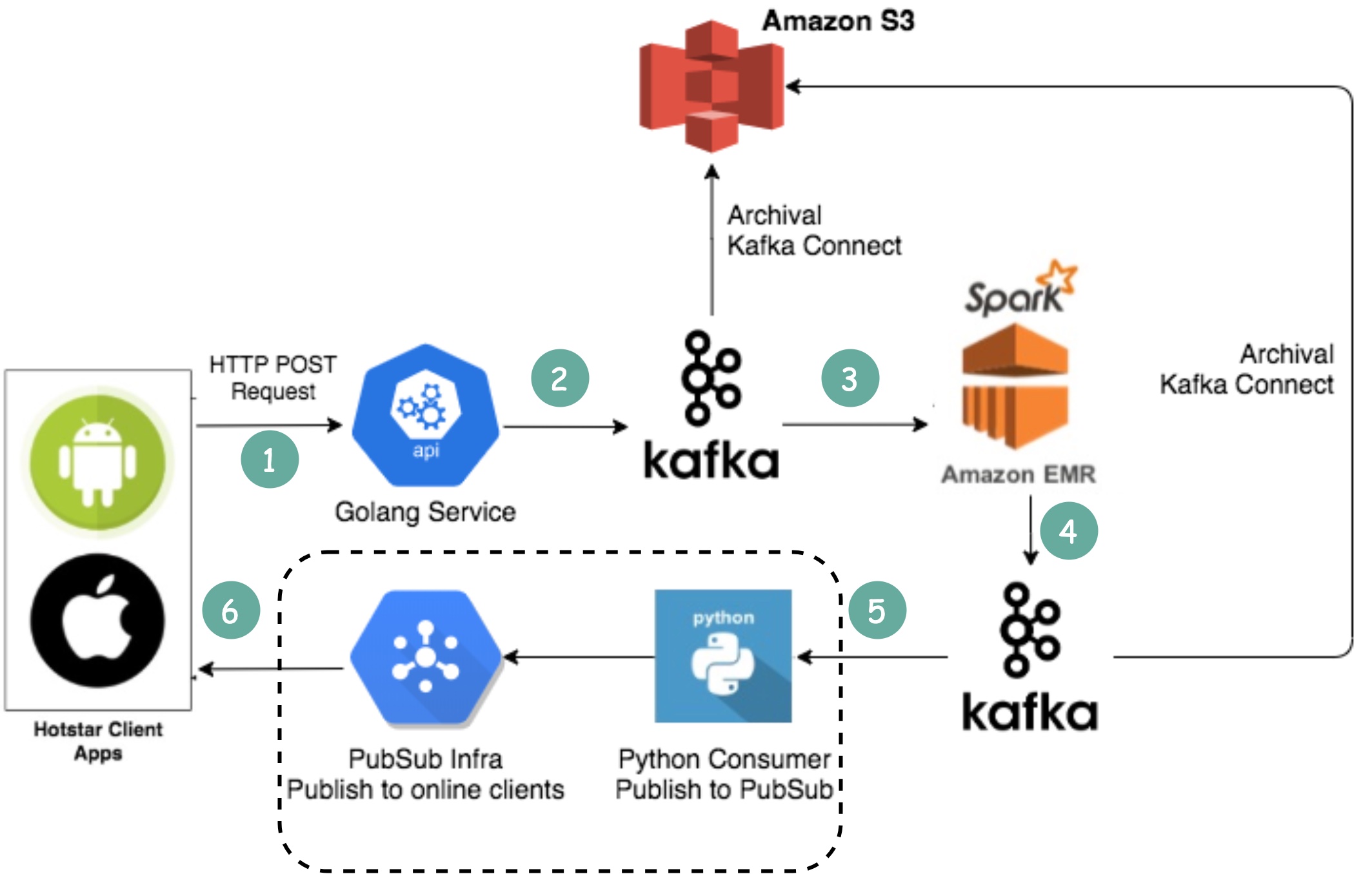 Emojis are delivered to other clients in real-time through the PubSub infrastructure. The PubSub infrastructure is interesting. Hotstar considered the following protocols: Socketio, NATS, MQTT, and gRPC, and settled with MQTT.