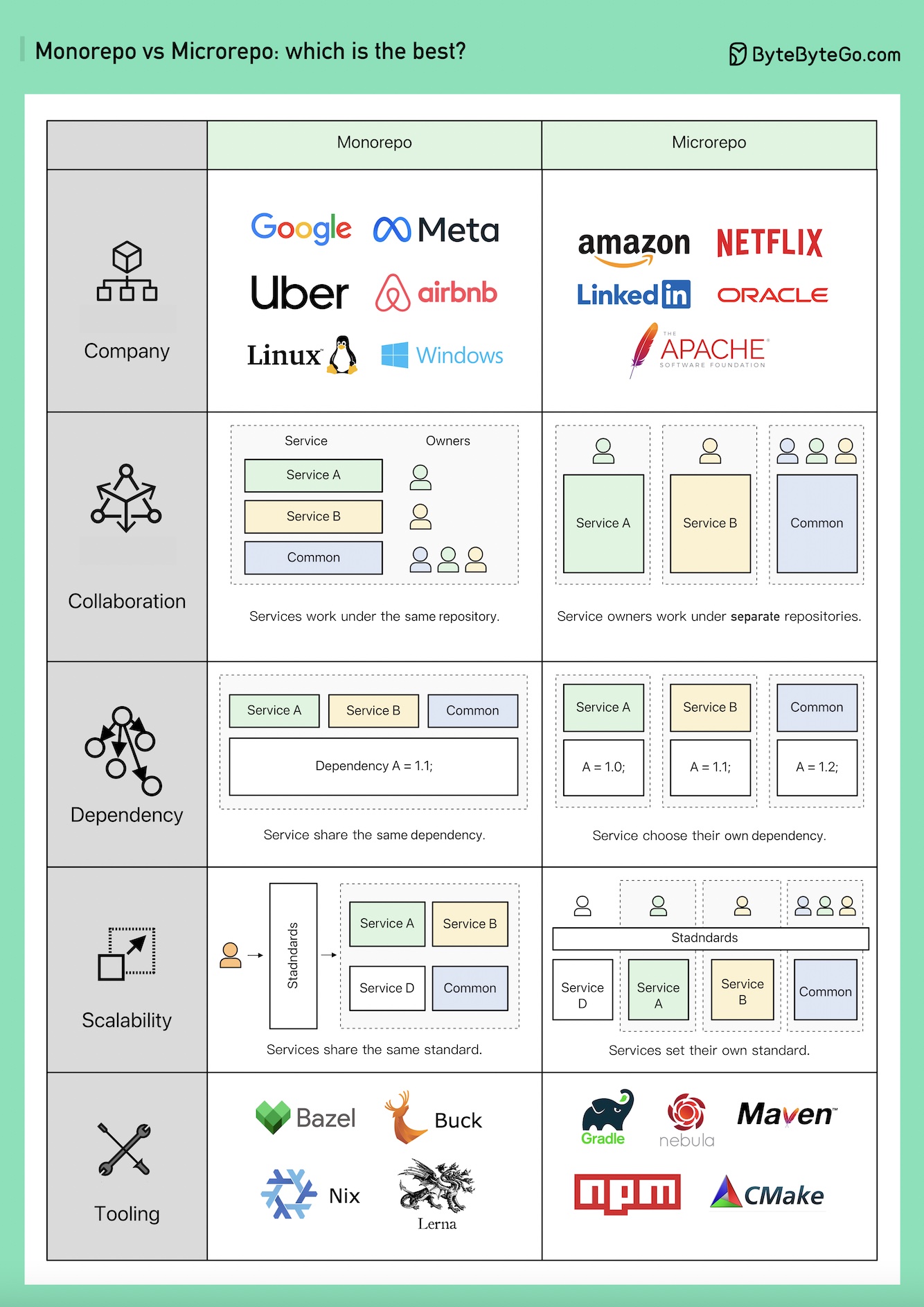 Microrepo can either set its own standard or adopt a shared standard by incorporating the best practices. It can scale faster for business, but the code quality might be a bit different. Google engineers built Bazel, and Meta built Buck. There are other open-source tools available, including Nix, Lerna, and others.